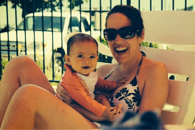 Since it was about a million degrees in Clear Lake and there's not much to do up there-I booked us a little cottage that had a swimming pool. T ditched her cloth diaper for a disposable Dora swim diaper. I slathered her in sunscreen, pulled a long sleeved swim top over her head, put her little sunnies and a hat on her.